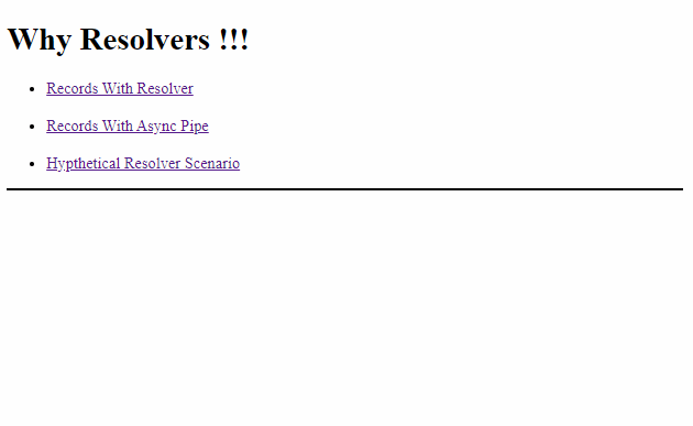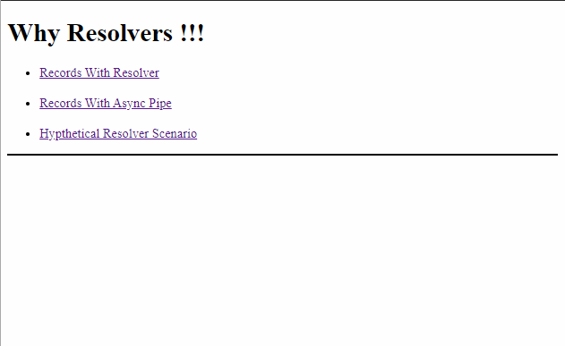 In simple terms, Resolvers are just plain-old middlewares in the angular routing pipeline which facilitate loading the data required for a component before the component is loaded. That’s it. No magic. It plugs into the routing pipeline and makes the API calls to get the data and when the data is ready, it activates the component. This way the component just appears with no “loading…”